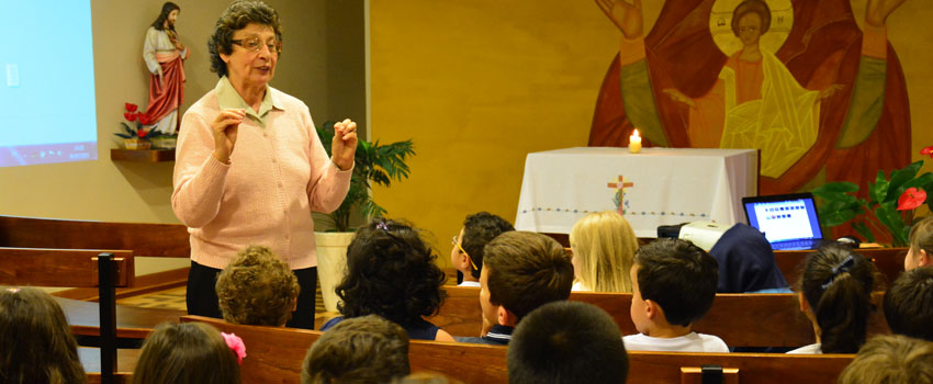 Os pequenos estudantes da Educação Infantil também participaram de momentos de espiritualidade. Em silêncio, eles cruzaram a capela da instituição de ensino, até o altar, onde foram recepcionados pela Agente de Pastoral, Ir. Teresinha Barcarolo, que os convidava a sentar ao redor dos símbolos pascais dispostos no chão. Entre eles, estavam os derivados do trigo e da uva que representam a aliança cristã, instituída na última ceia. A exemplo de Jesus Cristo, que na