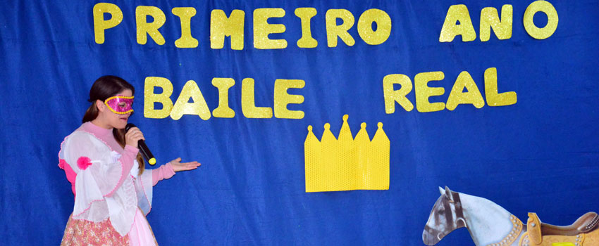 Para finalizar o momento lúdico, os pequenos estudantes, que estavam caracterizados com máscaras, foram convidados a participarem do “Baile Real”. Nele, executaram passos da “Valsa Real”: ritmo dançado por príncipes e princesas, durante as festas no castelo – em referência à obra lida.