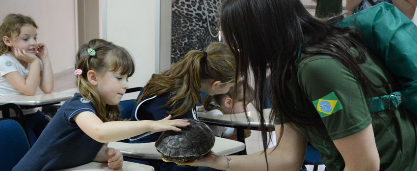 Foi o que aconteceu, na terça-feira (08), quando, reunidos no espaço multiuso da instituição de ensino, Notre-Dame (108)os pequenos educandos receberam a visita de acadêmicos dos cursos de Biologia e de Medicina Veterinária da Universidade de Passo Fundo.  Por meio de dramatizações e de conversas descontraídas, os graduandos que integram o Grupo de Estudos de Animais Silvestres, coordenados pela docente Michele Athaíde, apresentaram algumas das diversas espécies, como a tartaruga, a cobra, o veado, o sapo e a aranha. Além disso, foram questionados sobre as características, o habitat e a alimentação de cada uma delas.