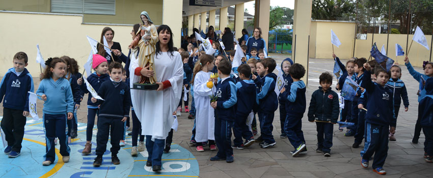 Os estudantes matriculados na Educação Infantil e nos demais segmentos do Ensino Fundamental, por sua vez, prestaram homenagens à mãe de Jesus entre sexta (02) e segunda-feira (05).Após reunirem-se no Auditório, as crianças matriculadas em cada um dos níveis de ensino seguiram em procissão, entoando cânticos de louvor, até o espaço sagrado preparado no pátio interno do educandário. Lá, auxiliadas pelas educadoras, coroaram a imagem de Nossa Senhora, sinalizando-a como Rainha do céu e da terra.