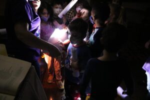 Munidos das lanternas que lhes deixavam vislumbrar os bem conhecidos espaços escolares, os educandos desvendavam as pistas que lhes conduziriam a um “tesouro”. Após o entusiasmo experimentado durante a busca, as crianças encenaram uma peça teatral e festejaram animadamente. Por fim, foram presenteadas pela Escola Notre Dame Menino Jesus com uma fronha alusiva ao evento.