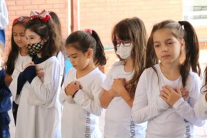 Impelidos a pausar suas rotinas para clamar pelo fim do conflito bélico no leste Europeu, discentes, docentes e funcionários escolares vestiram-se de branco e, reunidos no pátio e nos corredores do educandário enquanto empunhavam bandeiras e cartazes nos quais estava grafado o desejo de harmonia entre os povos, silenciaram-se por um minuto, antes de emprestarem suas vozes às preces coordenadas pela Pastoral Escolar.