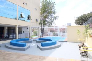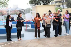 O Espaço de Convivência construído no pátio escolar, por sua vez, volta-se especialmente às crianças e aos pré-adolescentes que integram as turmas do Ensino Fundamental, objetivando descortinar a eles oportunidades de desenvolvimento de competências socioemocionais, seja por meio do diálogo a que convida a arena pedagógica ou da prática esportiva realizada em local inteiramente adequado. Afinal, conforme elucida a diretora escolar, Cátia Teixeira Sauer, tal área foi idealizada com o intuito de, mais que viabilizar a recreação, favorecer a formação de indivíduos dotados de habilidades adequadas às demandas atuais.
