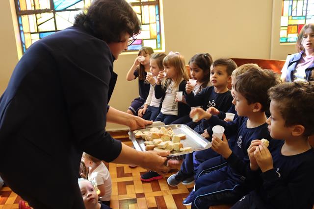 Conduzidos pela agente de Pastoral Escolar, Irmã Maria Janete Girelli, os partícipes conheceram a origem e o significado dos símbolos pascais e, ainda, relembraram os momentos vividos pelo filho de Deus, desde a entrada triunfal em Jerusalém até a Ressurreição. As crianças inscritas na Educação Infantil, por exemplo, participaram de uma lúdica representação da Santa Ceia, onde, na capela da instituição de ensino, puderam partilhar, simbolicamente, o pão e o vinho – representado pelo suco de uva.