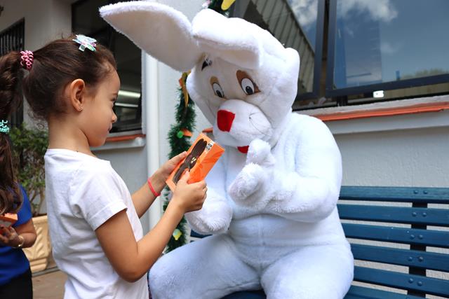 provavelmente, é o símbolo pascal mais querido pelas crianças – o coelho – também visitou a Escola, entregando doces e chocolate aos educandos matriculados na Educação Infantil e nas turmas de 1° e 2° Ano do Ensino Fundamental, gerando euforia e surpresa às crianças, que aproveitaram para abraçar e acariciar o visitante.