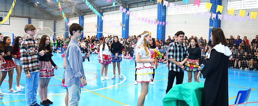 Para coroar essa verdadeira celebração da cultura popular brasileira, da alegria de ser Notre Dame e da união entre escola e família, os concluintes do Ensino Fundamental encenaram um cômico casamento caipira.